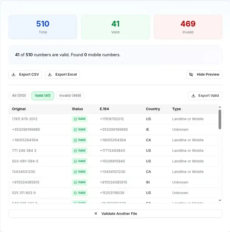 Deleting Invalid Numbers Without Review: Some flagged numbers might just be formatted wrong. Always review before deleting. Our validator shows you exactly what's wrong so you can decide whether to fix or remove.