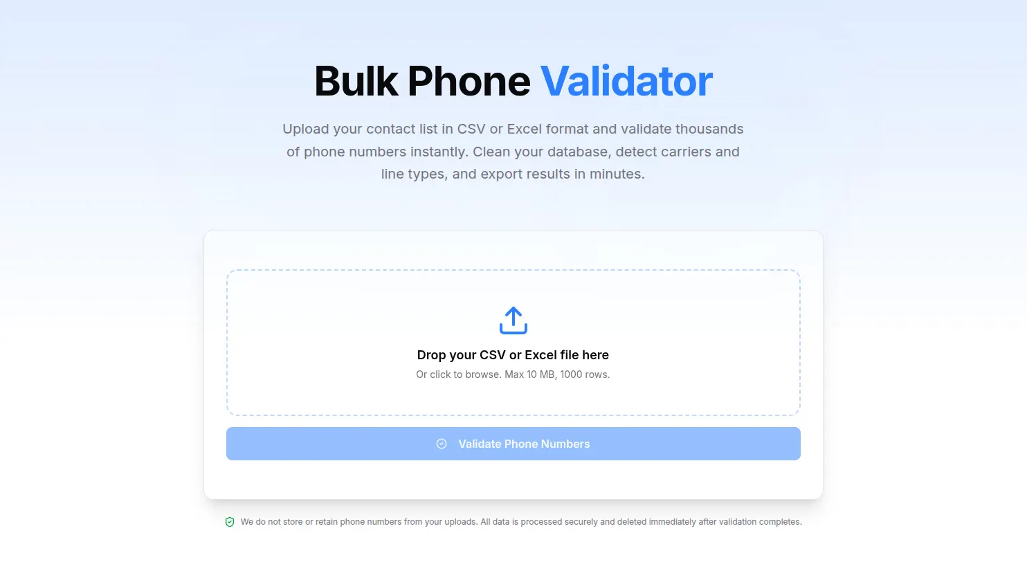 - Validates up to 1,000 rows per upload (roughly 5,000-10,000 numbers)